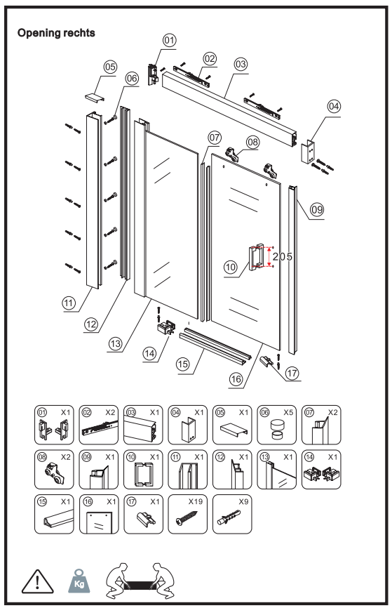 - Het stelbereik van de douchedeur is 1180-1200 (nis) /1188-1208 (icm zijwand) mm
