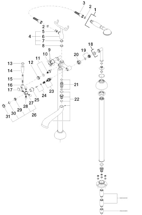 Dornbracht Madison 2-gats badmengkraan voor vrijstaande montage, met spoeldouche Messing