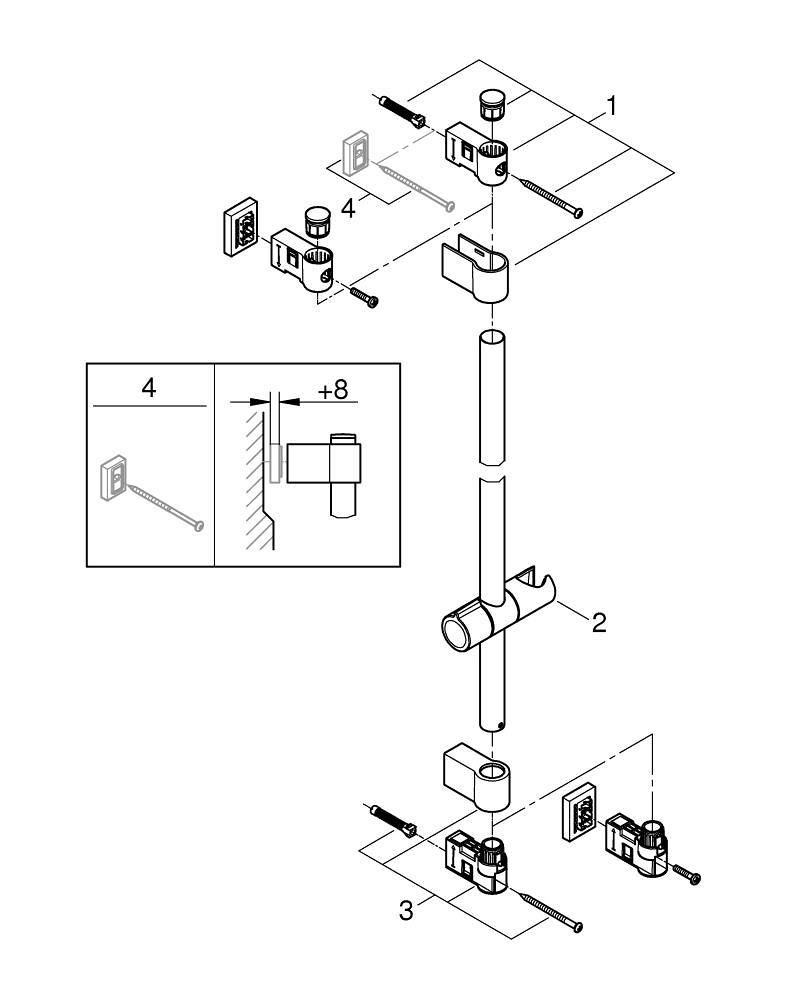 Tip: Heb je geen bestaande boorgaten en wil je dit graag zo houden? Gebruik dan Grohes supersterke QuickGlue (41247000, apart verkrijgbaar). Voor montage van deze glijstang zijn 2 stuks montagelijm nodig.
