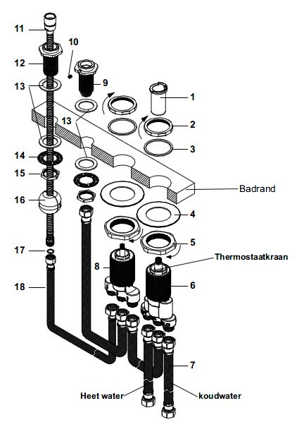 - Overloopgat: als het water te hoog komt, loopt het automatisch weg